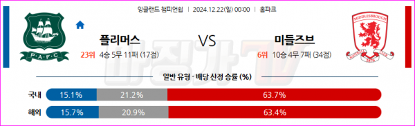 12월 22일 잉글랜드 챔피언쉽 플리머스 아가일 FC 미들즈브러 FC 해외축구분석 스포츠분석