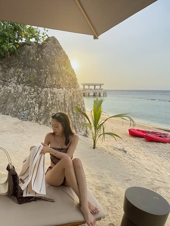 공개된 사진 속 이솔이는 브라운 톤 패턴의 튜브톱 수영복을 입고 있다. 어깨 라인이 드러나는 상의는 쇄골과 상체 라인을 자연스럽게 강조하며, 하의는 끈 디테일로 슬림한 허리선과 균형 잡힌 몸매를 돋보이게 한다. 선베드에 앉아 자연스럽게 포즈를 취한 이솔이는 군살 없는 보디라인을 자랑하며, 브라운 톤 비치웨어와 어우러져 차분한 분위기를 연출했다.