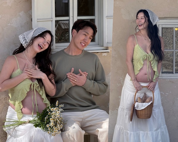 공개된 사진 속 나비는 연둣빛의 루즈한 슬리브리스 톱에 화이트 롱 스커트를 매치해 내추럴한 무드를 완성했다. 리본 디테일이 더해진 헐거운 톱은 자연스럽게 배를 감싸며 편안함을 강조했고, 그 아래로 드러난 D라인이 부드러운 봄 햇살과 어우러지며 따뜻한 분위기를 자아냈다. 머리에는 레이스 보닛을 매치해 한층 더 청순한 무드를 더했다.