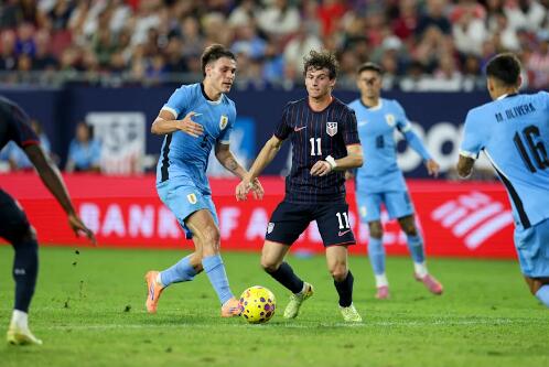 USMNT의 스타 브렌든 애런슨은 국제 친선경기에서 두 번째 하프 동안 공을 컨트롤하는 장면이 포착되었다.