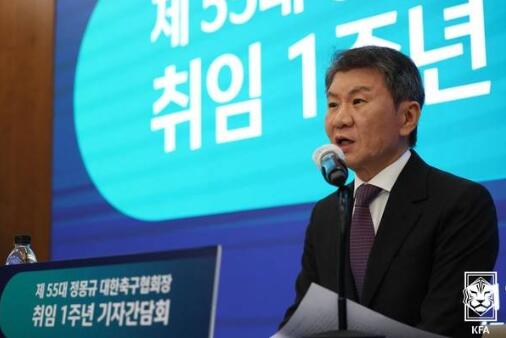 11일 서울 신문로 포니정재단빌딩과 인근 식당에서 열린 정 회장 취임 1주년 기자 간담회에서, 축구협회는 이번 집행부의 주요 사업 목표를 발표한 뒤 정 회장이 기자들과 질의응답을 진행했다.