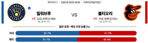 5월 20일 MLB 밀워브루 vs 볼티오리