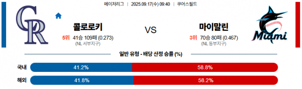 콜로라도의 타선은 홈 경기 리셋 징크스가 있다. 이 문제를 어떻게 해결하느냐가 관건일듯. 마이애미 타선이 좌완에게 그다지 강하지 않음을 고려한다면 프리랜드의 투구는 기대를 걸 여지가 많은 편. 물론 리셋 징크스를 고려한다면 페레즈 역시 이전보다는 나아진 투구를 기대할수 있지만 여긴 쿠어스 필드다. 선발에서 앞선 콜로라도 로키스가 신승을 가져갈 것이다.
